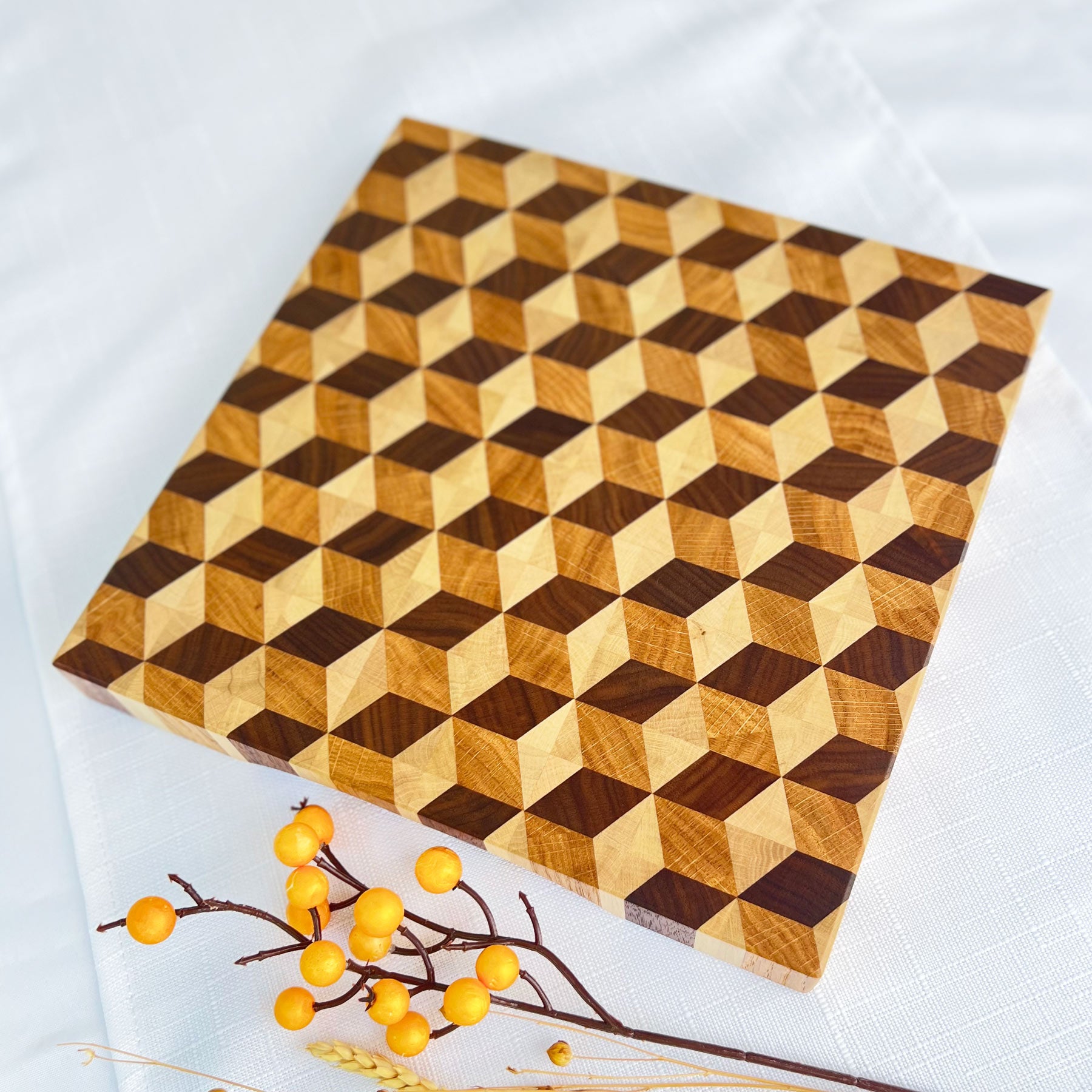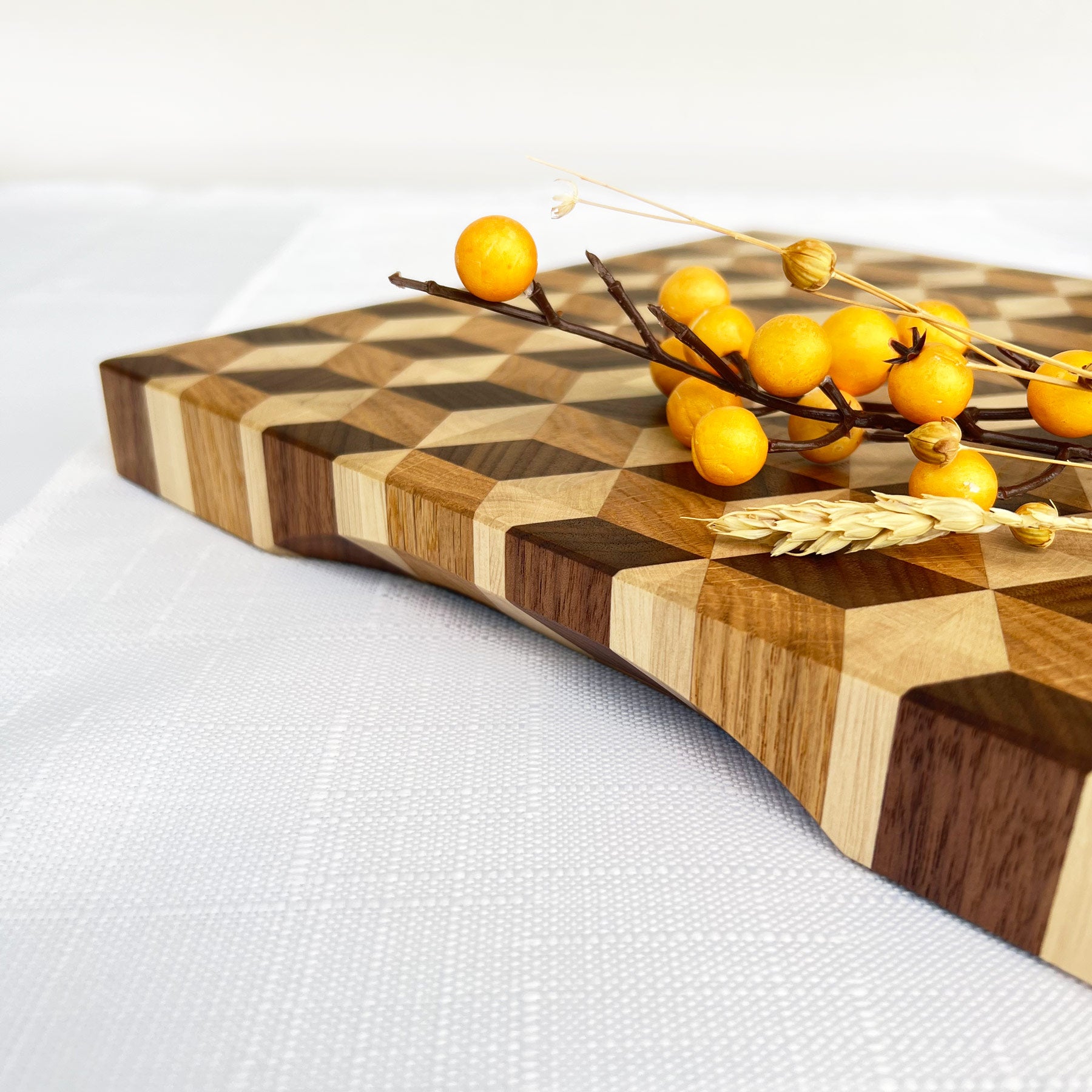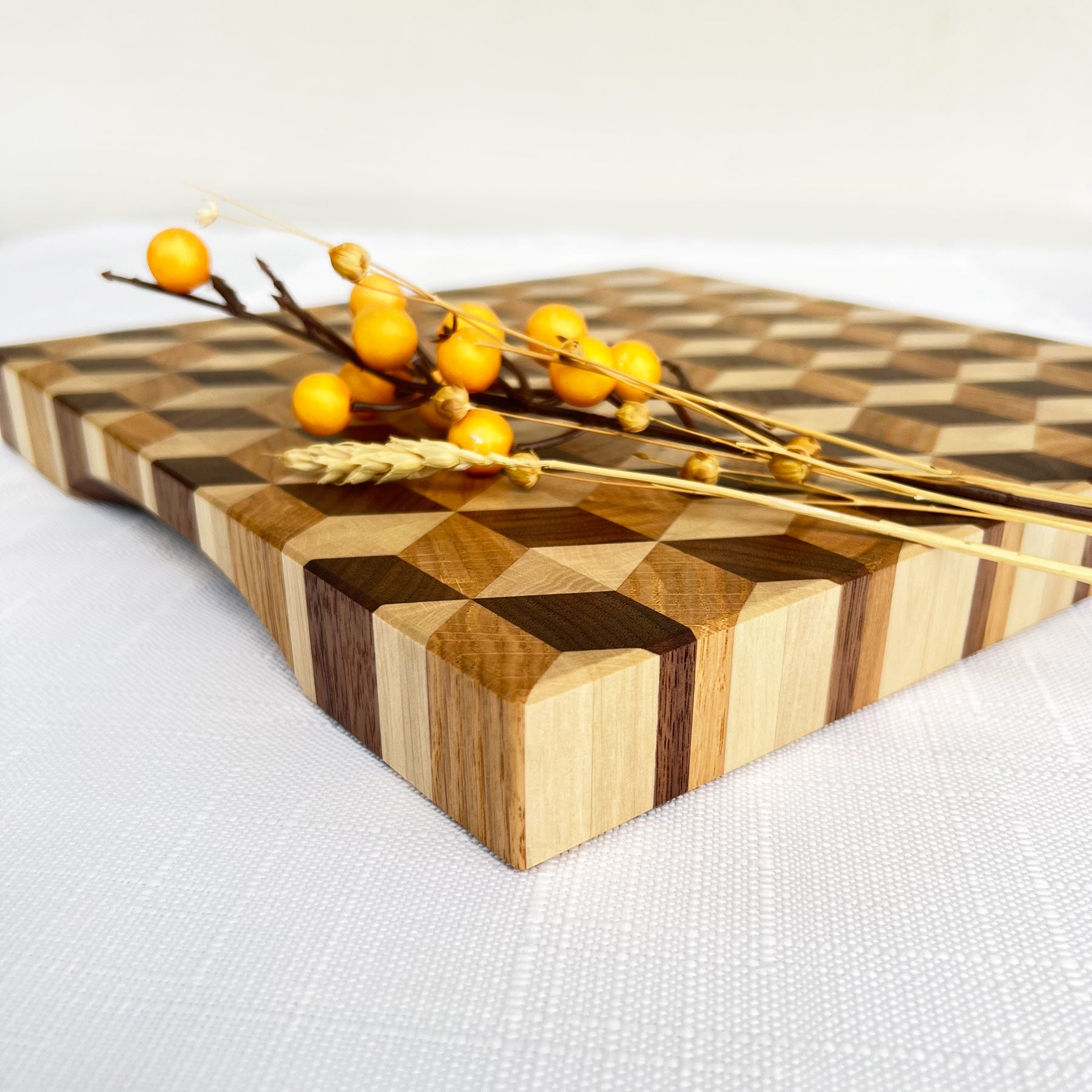 - 3D Stirnholz-Schneidebrett aus Schwarznuss, Eiche & Hainbuche