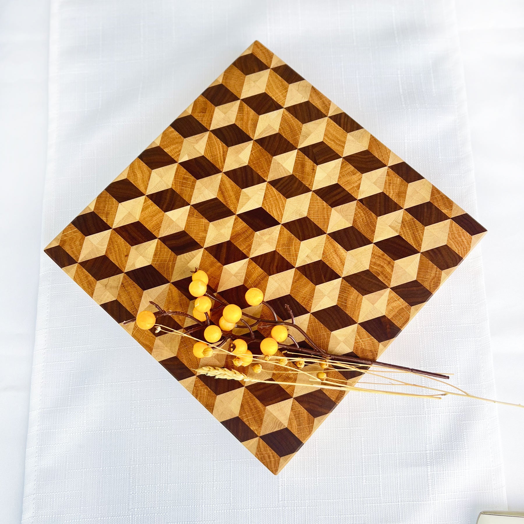 Dieses außergewöhnliche Schneidebrett ist mehr als nur ein Küchenutensil – es ist ein Statement. Gefertigt in Österreich mit aufwendiger Handarbeit, vereint es die Schönheit und Qualität von drei edlen Hölzern: amerikanischer Nuss, Eiche und Hainbuche. Die aufwendige Stabverleimung sorgt für hohe Widerstandsfähigkeit, während die geölte Oberfläche das Holz schützt und seine natürliche Schönheit bewahrt. Die spezielle Anordnung des Holzes erzeugt einen faszinierenden 3D-Effekt, der dieses Brett zu einem echten Blickfang macht.