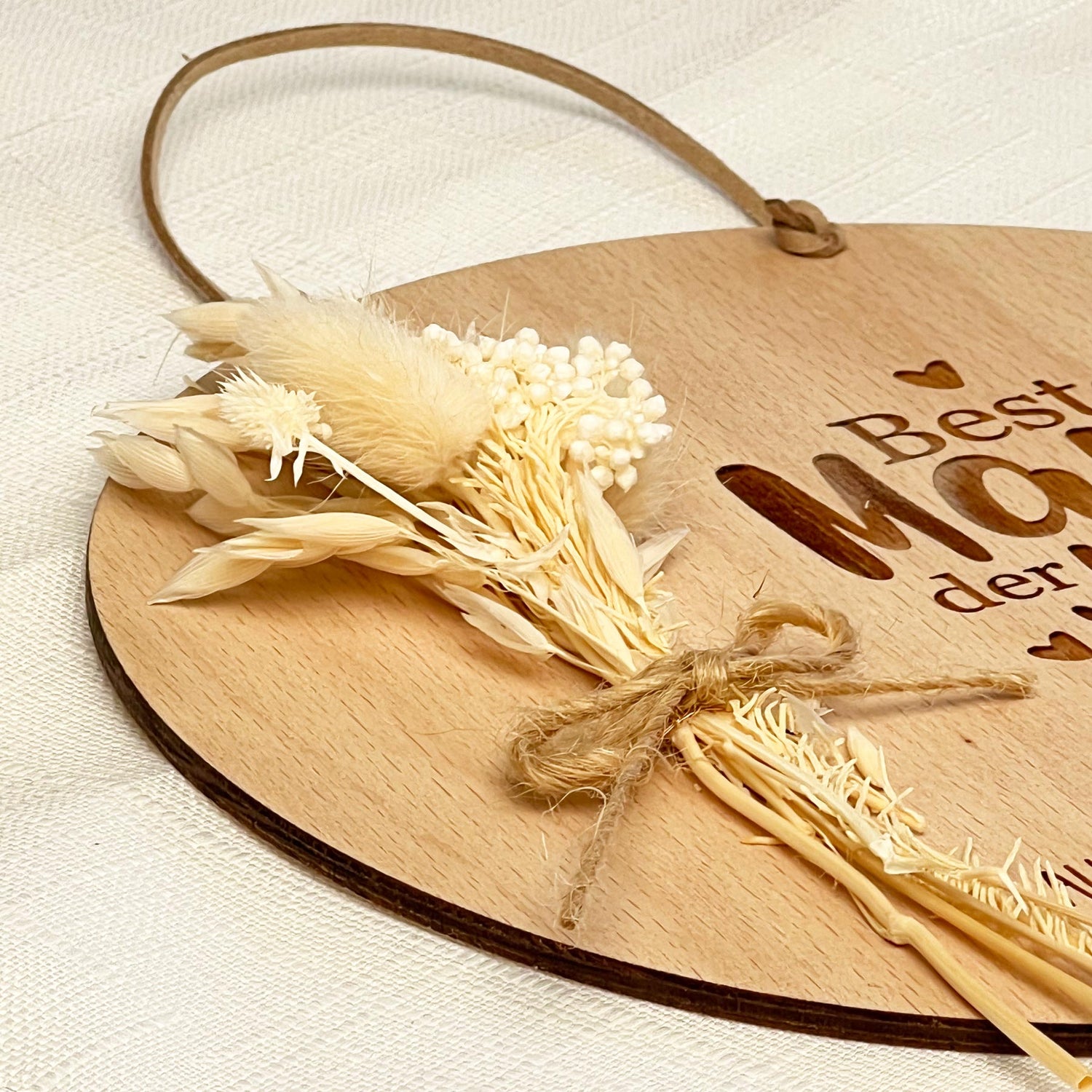 - Personalisiertes Holzschild aus Buchensperrholz und Trockenblumen