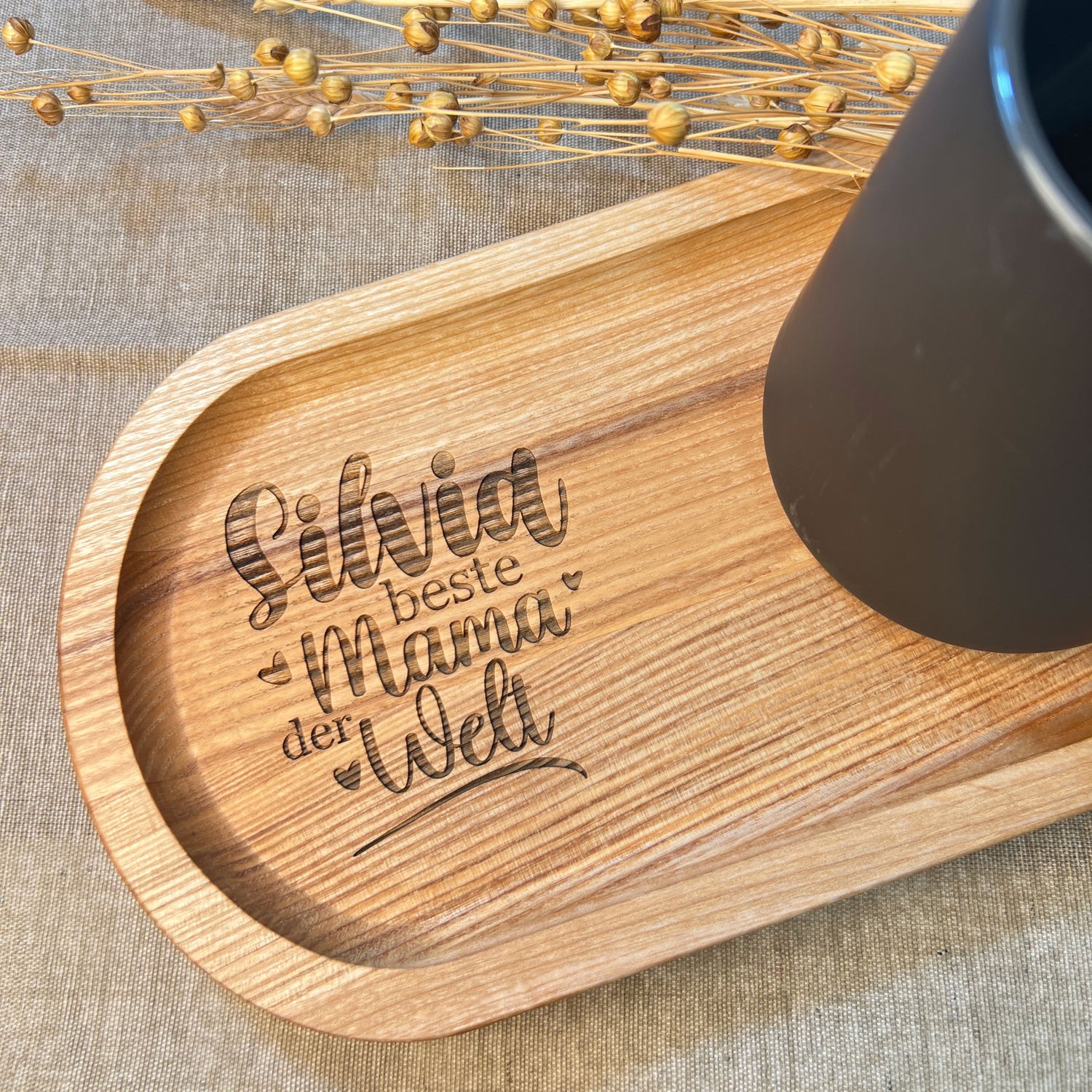 Graviertes Holztablett mit Becher - groß | Mama oder Papa