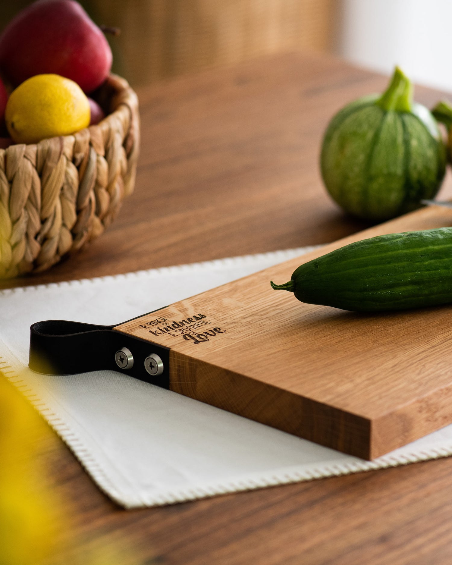Massives Eichenholz Schneidebrett mit Lederband und Gravur