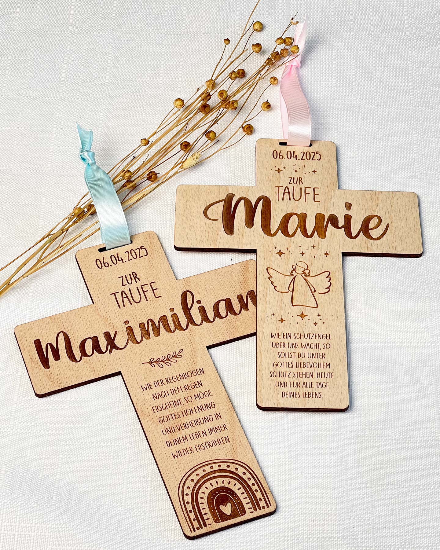 Ein Taufkreuz ist weit mehr als nur eine Dekoration – es ist ein Symbol des Schutzes, der Liebe und des Glaubens. Unser personalisiertes Taufkreuz aus hochwertigem Buchensperrholz wird liebevoll mit dem Namen des Kindes und einem Segensspruch graviert und ist damit ein ganz besonderes Geschenk zur Taufe.