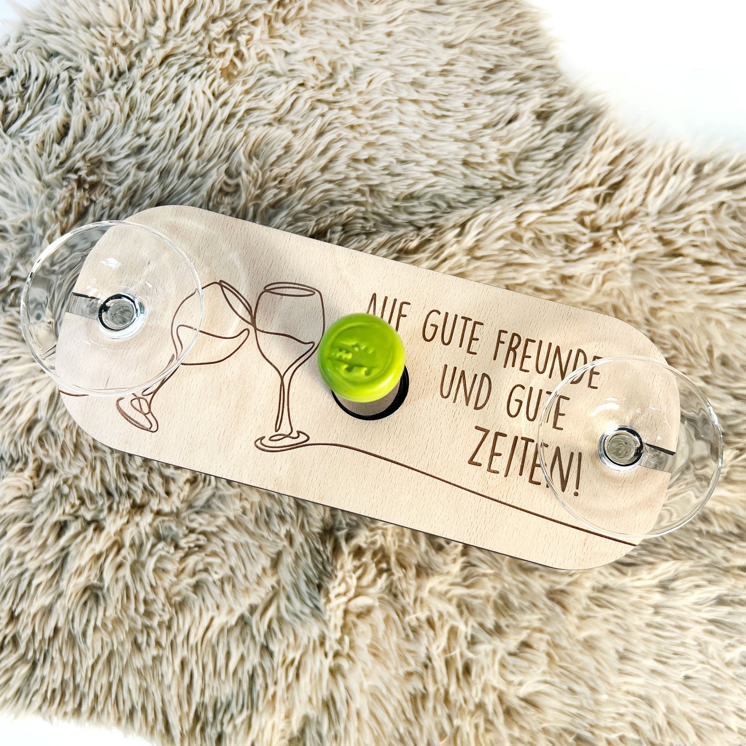 Überrasche deine besten Freunde mit einem guten Tropfen Wein und einem besonderen Zusatz: Einer einzigartigen Weinglashalterung aus Holz, graviert mit liebevollem Spruch. Einfach an einer Flasche Wein anzubringen, bietet der Weinglashalter Platz für zwei edle Weingläser und ist ein wunderbares Accessoire für gesellige Abende. Ideal, um deinen Lieblingswein mit deinen besten Freunden zu teilen und schöne Erinnerungen zu schaffen.